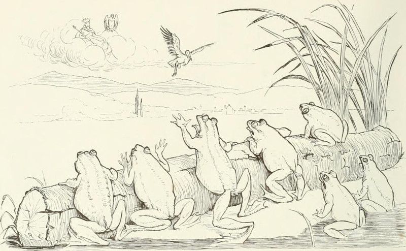 Χαρακτικό του Randolph Caldecott (1846-86) εμπνευσμένο από τον μύθο του Αισώπου «Οι βάτραχοι που ζητούσαν βασιλιά»