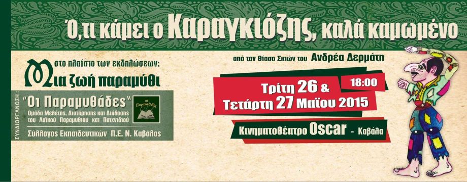 Καθοδόν για την Καβάλα και για το εξαήμερο εκδηλώσεων «Μια ζωή παραμύθι», βρίσκεται ο αγαπημένος ήρωας μικρών και μεγάλων που ακούει στο όνομα Καραγκιόζης. Η λαϊκή αυτή φιγούρα του βασανισμένου ανθρώπου που όμως ποτέ δεν χάνει το χιούμορ του, θα μοιραστεί μαζί μας τις αστείες αλλά και διδακτικές ιστορίες την Τρίτη 26 και την Τετάρτη 27 Μαϊου 2015 στις 18:00 στο κινηματοθέατρο OSCAR.