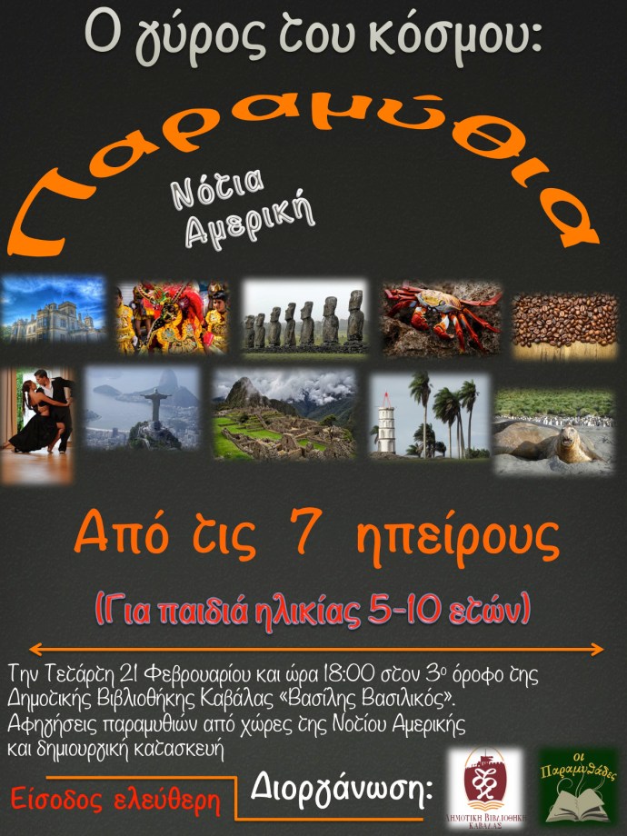 Αυτήν την Τετάρτη, 21 Φεβρουαρίου στις 6 το απόγευμα τα παραμύθια μάς έρχονται από την ήπειρο της Νότιας Αμερικής, από χώρες όπως την Βραζιλία, την Αργεντινή, την Χιλή, κλπ.