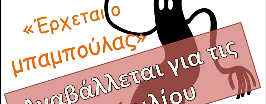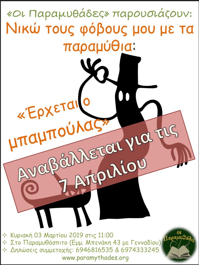 Η προγραμματισμένη εκδήλωσή μας για την Κυριακή 3 Μαρτίου 2019 με τίτλο «Έρχαται ο μπαμπούλας» αναβάλεται λόγω της διεξαγωγής της Αλφαβητοπαρέλασης η οποία με την σειρά της είχε αναβληθεί. Η αναβολή προκαλεί μια άλλη αναβολή λοιπόν.