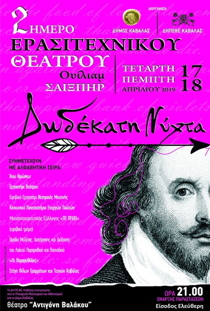 Επτά ερασιτεχνικές ομάδες της πόλης ενώνουν τις δυνάμεις τους και συναντιούνται την Τετάρτη 17 και την Πέμπτη 18 Απριλίου στις 9 το βράδυ, στο θέατρο Αντιγόνη Βαλάκου, μετά από πρόταση της Προέδρου του ΔΗ.ΠΕ.ΘΕ. Καβάλας κ. Κορίνας Χιώτη Πρασσά και του Καλλιτεχνικού Διευθυντή του ΔΗ.ΠΕ.ΘΕ. Καβάλας κ. Θοδωρή Γκόνη,για να παρουσιάσουν το θεατρικό έργο του Ουίλιαμ Σαίξπηρ«Δωδέκατη Νύχτα».