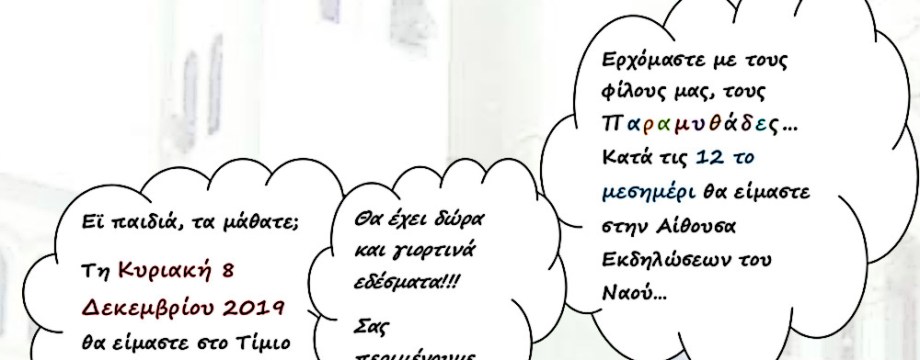 Την Κυριακή 8 Δεκεμβρίου, γύρω στις 12 το μεσημέρι, θα βρεθούμε στην αίθουσα εκδηλώσεων του Ιερού Ναού της Υψώσεως του Τιμίου Σταυρού στην Καβάλα. Μαζί μας και οι άτακτοι ήρωες των παιδικών μας Χριστουγέννων, οι καλικάντζαροι…τα καρκατζέλια…οι καρκάντζελοι.