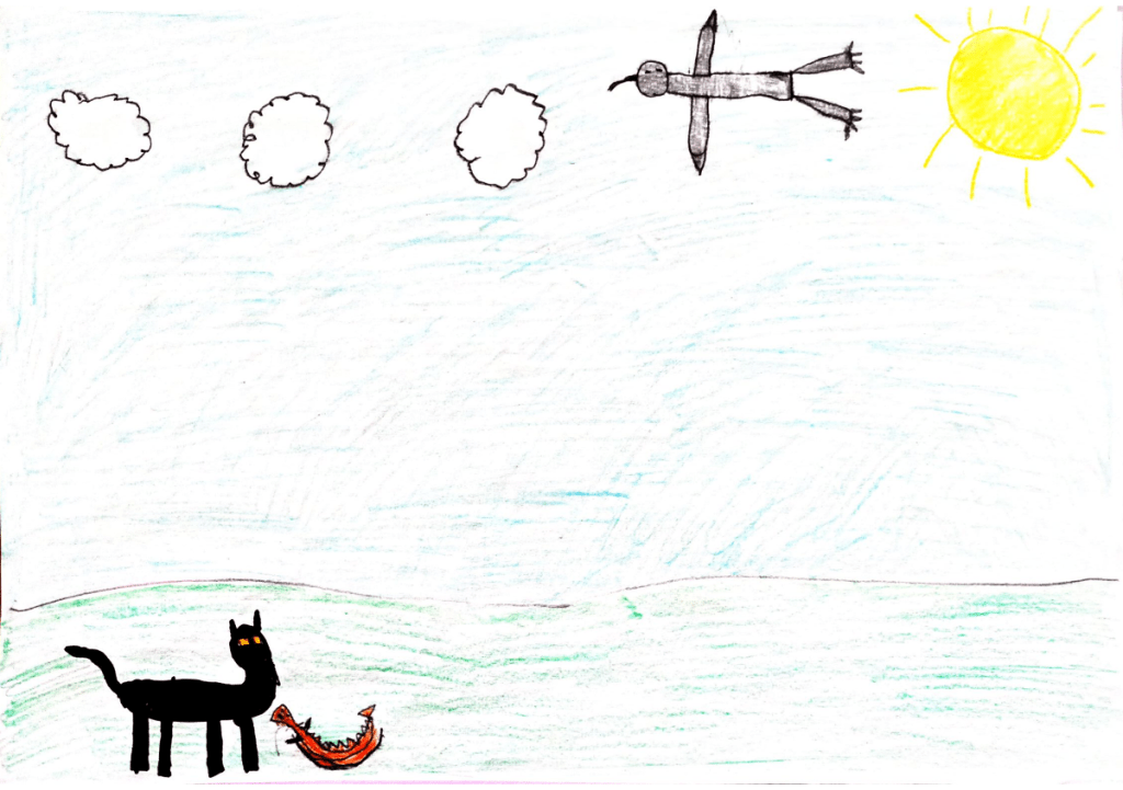 Έβαλα το γράμμα στην τσέπη, βγήκα και τι να δω! Η γάτα, που χρόνια κυκλοφορούσε στη γειτονιά, είχε βγάλει από τον κάδο των σκουπιδιών ένα ψαροκόκκαλο μεγάλο και με κοίταζε περίεργα. Πολύ περίεργα!