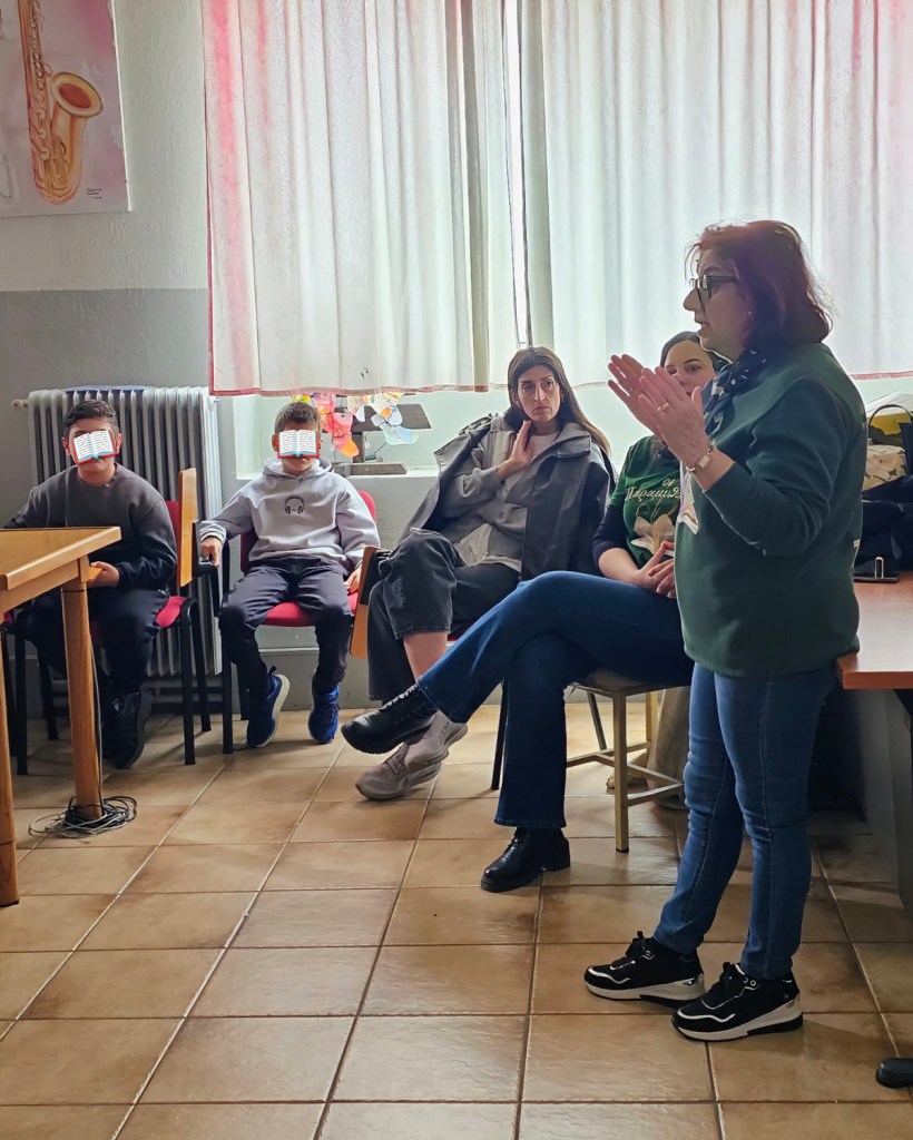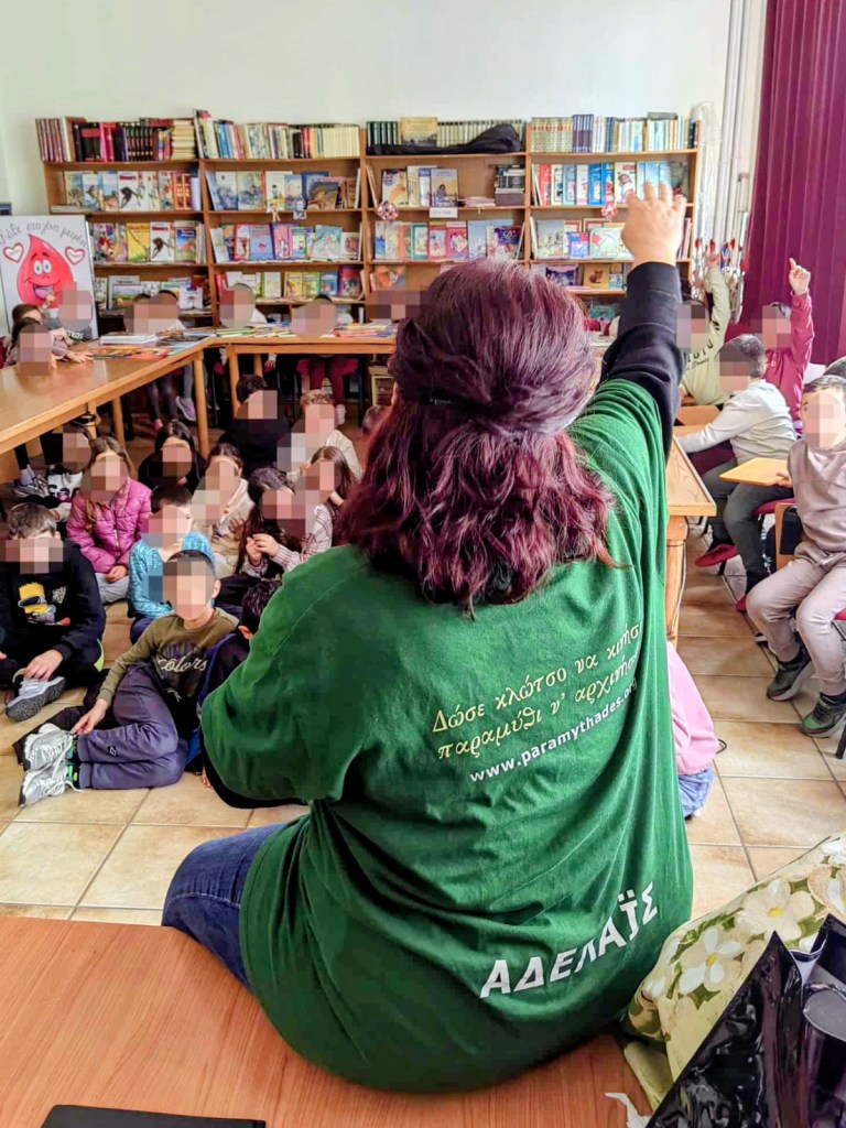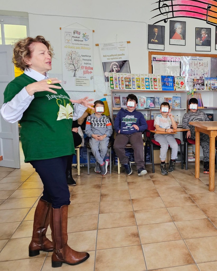 Μας οδήγησαν στην βιβλιοθήκη του σχολείου, την πλούσια σε υλικό. Τα παιδιά χωρίστηκαν σε δύο γκρουπ, με πρώτο αυτό της τετάρτης, πέμπτης και έκτης τάξης και δεύτερο αυτό με τα παιδιά των τριών μικρότερων τάξεων. Τρυφερά προσωπάκια και περίεργα ματάκια γέμισαν τον όμορφο χώρο.