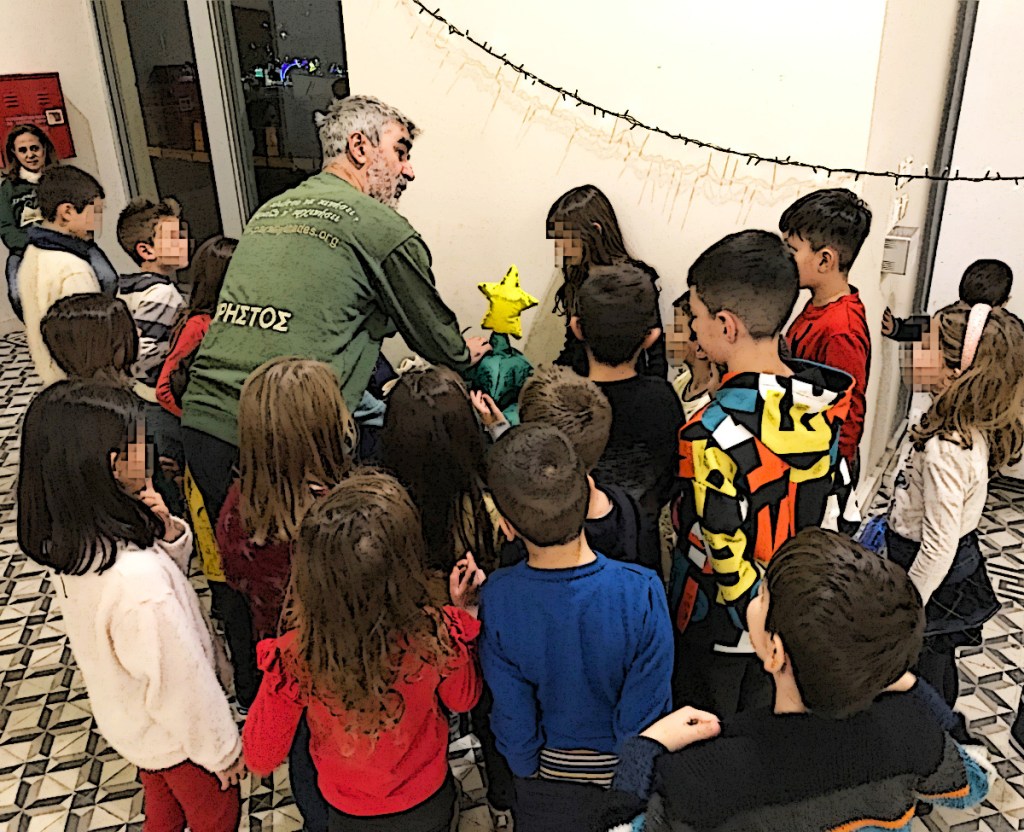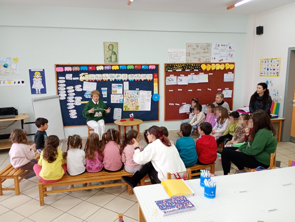 Η επίσκεψή μας διοργανώθηκε στα πλαίσια του Σχεδίου Δράσης: «Με ένα Βιβλίο Ταξιδεύω!«. Μιλήσαμε για την προφορική παράδοση και αφηγηθήκαμε λαϊκούς μύθους, αινίγματα και παραμύθια. Από την επίσκεψή μας δε θα μπορούσαν να λείπουν τα παιχνίδια! Τόσο τα παιδιά όσο και εμείς διασκεδάσαμε και γελάσαμε με την καρδιά μας! Λίγο πριν την αποχώρησή μας, μας χάρισαν «παραμυθένια» δώρα φτιαγμένα με πολλή αγάπη από παιδικά χεράκια. Συγκινηθήκαμε πολύ και τους ευχαριστούμε για την όμορφη πρόσκληση!