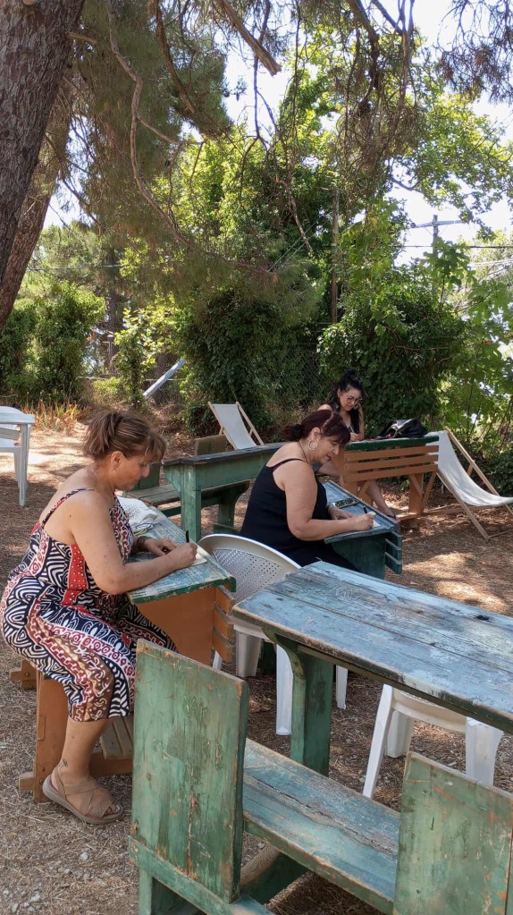 Παρακολουθήσαμε επίσης το εργαστήρι ενηλίκων «Ταξίδι στα κρυμμένα μυστικά των λαϊκών παραμυθιών» το πρωί του Σαββάτου που πραγματοποιήθηκε κάτω από σκιερά πεύκα, στην αυλή του παλιού δημοτικού σχολείου.