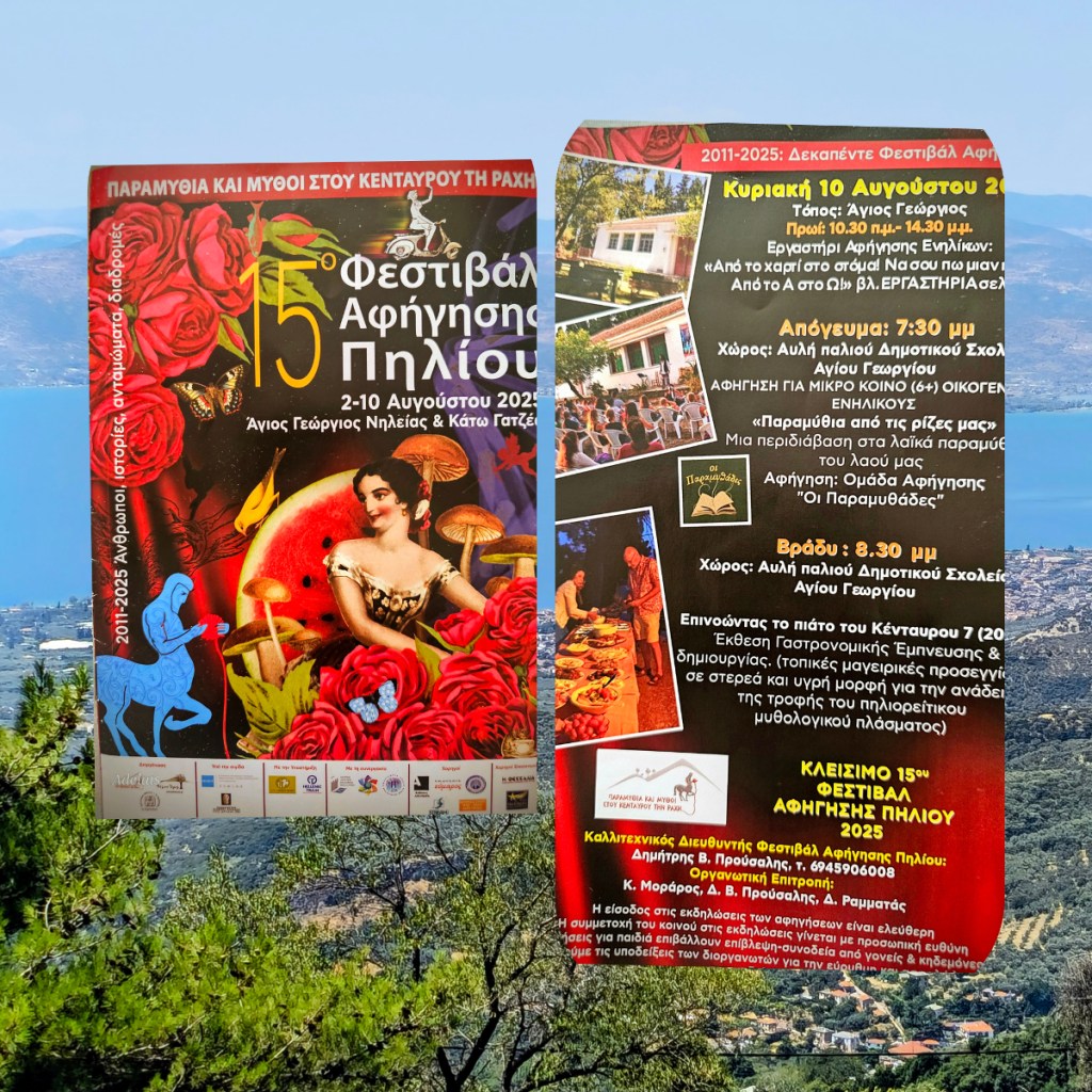 Με χαρά η ομάδα των Παραμυθάδων δέχτηκε πρόσκληση να συμμετάσχει στο 15ο Φεστιβάλ Αφήγησης Πηλίου 2025, «Παραμύθια και μύθοι στου Κενταύρου την ράχη» , που πραγματοποιήθηκε από τις 2 έως τις 10 Αυγούστου, στον Άγιο Γεώργιο Νηλείας και κάτω Γατζέα.