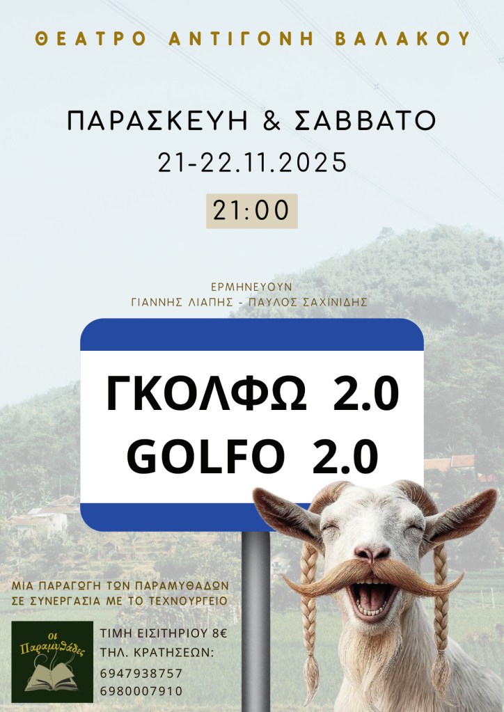 Την Παρασκευή 21 και το Σάββατο 22 Νοεμβρίου 2025, «Οι Παραμυθάδες» φιλοξενούμε την θεατρική παράσταση «Γκόλφω 2.0» από το Τεχνουργείο στο θέατρο «Αντιγόνη Βαλάκου». Το κλασσικό βουκολικό δράμα του Σπυρίδωνος Περεσιάδη, έρχεται με μια φρέσκια ματιά, με μια διασκευή που θα συζητηθεί.