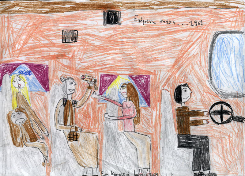 Ζωγραφιά της Εύης εμπνευσμένη από την εκδήλωση που ετοιμάζουμε με τίτλο «Επόμενη στάση…1961» σε κείμενο-διαλόγους της Γιούλης Αποκατανίδου.