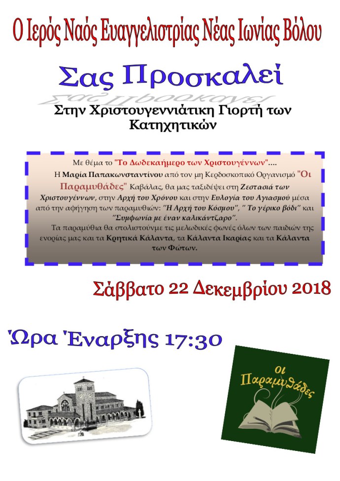 Το Σάββατο 22 Δεκεμβρίου ήμασταν καλεσμένοι από τις κατηχητικές συντροφιές Ι. Ν. Ευαγγελίστριας Ν. Ιωνίας Μαγνησίας. Έτσι λοιπόν ξεκίνησα για την πόλη του Βόλου για να συναντήσω μικρούς και μεγάλους και να τους αφηγηθώ Χριστουγεννιάτικα παραμύθια της λαϊκής μας παράδοσης.