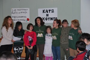 Τα παιδιά μας υποδέχθηκαν με την γνώριμη πια ζεστασιά τους. Μιλήσαμε για το ιστορικό της μέρας και για την δύναμη των νέων ανθρώπων να αγωνίζονται για τα ανθρώπινα δικαιώματα. Οι παραμυθο-κύβοι όμως μας περίμεναν για παιχνίδι και την δημιουργία του παραμυθιού. Ο πρώτος μικρός εθελοντής πέταξε ψηλά τον πρώτο κύβο και μας έδωσε το πρώτο θέμα… ένας χαμογελαστός ήλιος, στο δεύτερο πέταγμα μας ήρθε μια κλειδαριά και στο τρίτο….να μία σκούπα!! Το παραμύθι που δημιούργησαν τα παιδιά ήταν πέρα από κάθε προσδοκία: