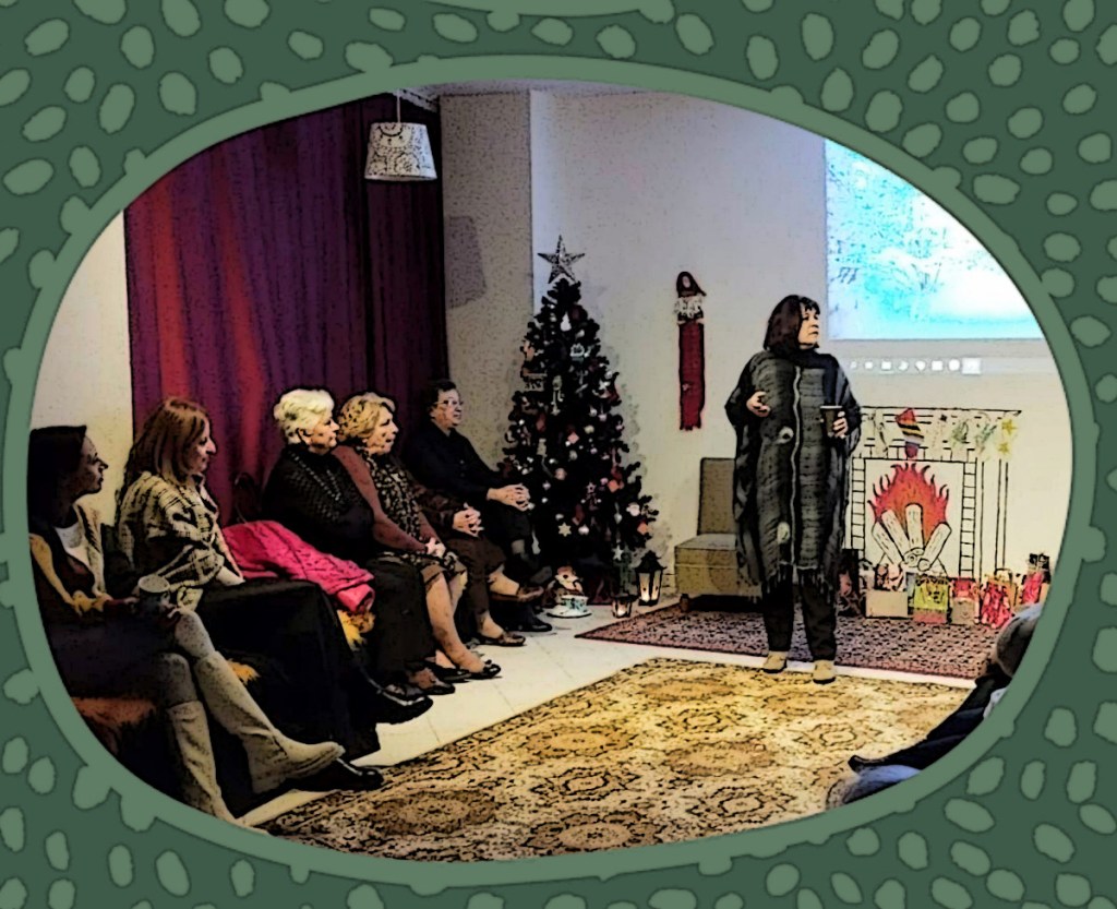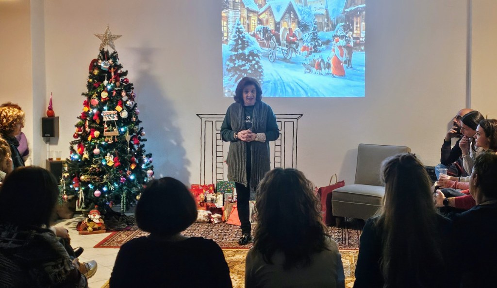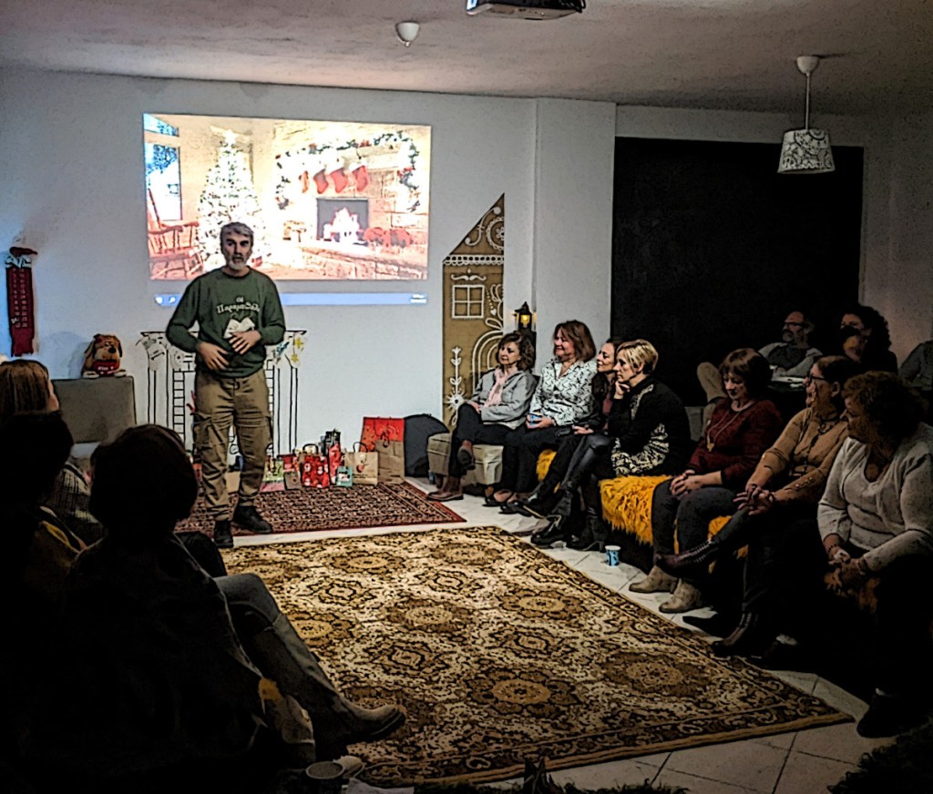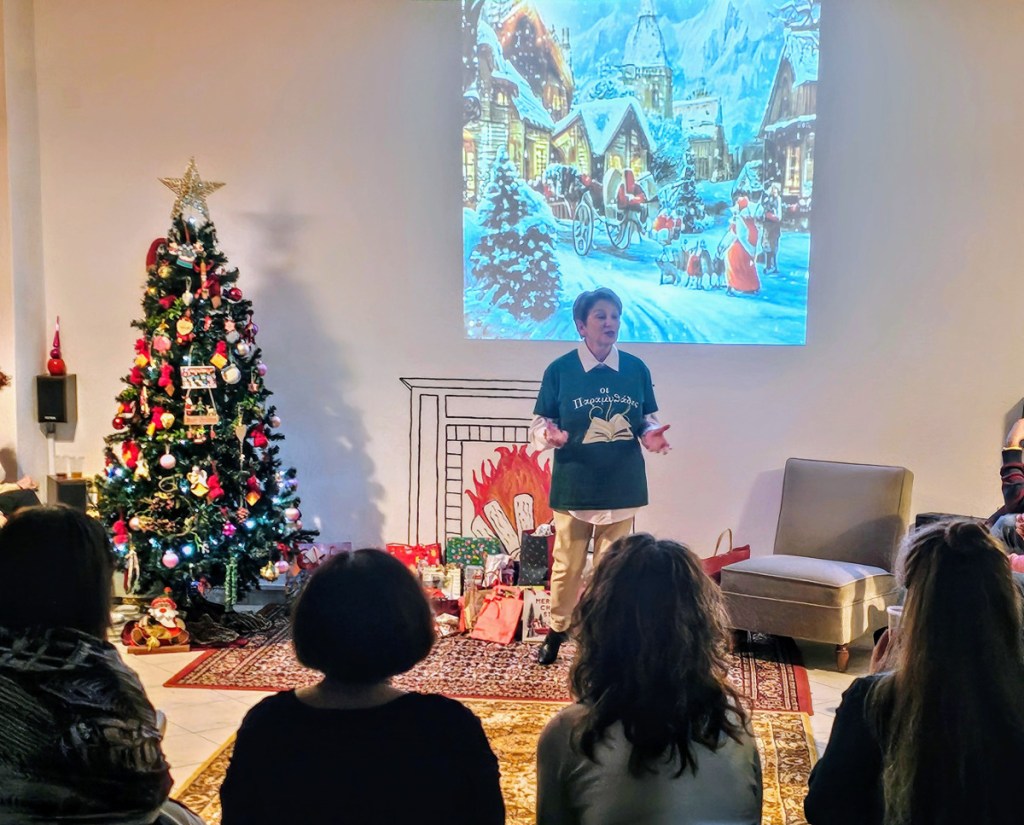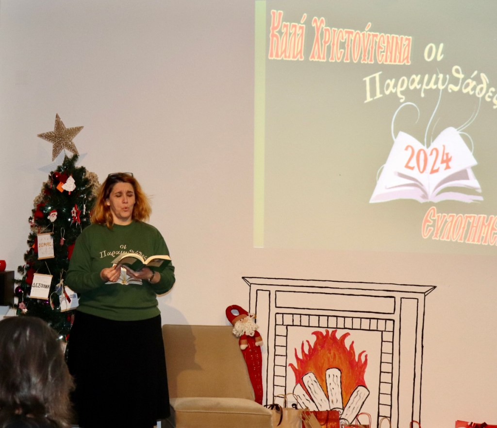 Οι ζεστές αγκαλιές, τα χαμόγελα, οι ευχές κυριαρχούσαν στον χώρο. Καθίσαμε όλοι μας σε μια θέση σαν τα μικρά πρωτάκια στο σχολείο. Τα φώτα χαμήλωσαν, η πρόεδρος του συλλόγου μας, Αρετή Τσιφλίδου, καλωσόρισε τους αγαπημένους μας φίλους, με τον δικό της ξεχωριστό τρόπο και οι αφηγήσεις των παραμυθιών ξεκίνησαν, με την Ελισάβετ Κεσικιάδου, να αφηγείται την «Γυναίκα από ξύλο» κι έπειτα την Αδελαΐδα Ράπτη με «το χρυσόψαρο». Την σκυτάλη πήρε ο Χρήστος Τσίρκας με το αστείρευτο χιούμορ του και με ευτράπελες ιστορίες του Νασραδίν Χότζα, ανεβάζοντας το κέφι, ακόμα πιο πολύ. Ακολούθησε η Καλλιόπη Σωτηρέλη με το ευθυμογράφημα «Τα Χριστούγεννα που χάθηκαν» του Σταμ Σταμ (Σταμάτη Σταματίου).