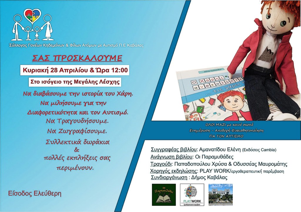 Την Κυριακή των Βαϊων, 28 Απριλίου 2024 στις 12:00 το μεσημέρι στο ισόγειο της Μεγάλης Λέσχης, συμμετέχουμε σε μια εκδήλωση με πολύ όρεξη και αγάπη. Αποδεχόμαστε την πρόσκληση του Συλλόγου Γονέων, Κηδεμόνων και Φίλων Ατόμων με Αυτισμό Π.Ε. Καβάλας για να μιλήσουμε για την διαφορετικότητα και τον αυτισμό. Το όχημα που θα μας μεταφέρει καθόλη την διάρκεια της εκδήλωσης είναι το παραμύθι της Ελένης Αμανατίδου «Ο Χάρης ανακαλύπτει …τις χάρες του» των εκδόσεων Cambia.